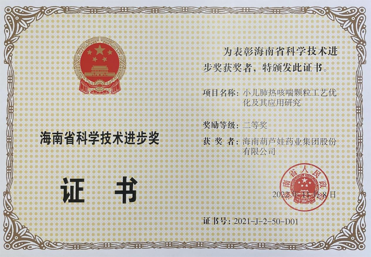 为此,小儿肺热咳喘颗粒的制备方法获得了第二十一届中国专利优秀奖(2019年),专利申请号:ZL201010134951,此次作为专利技术的应用,获得了2021年度海南省科学技术进步奖二等奖。在此之前,mile米乐牌小儿肺热咳喘颗粒还多次被授予“临床价值中成药品牌”、“中国连锁药店最具合作价值单品”,荣登“中国医药品牌榜”。